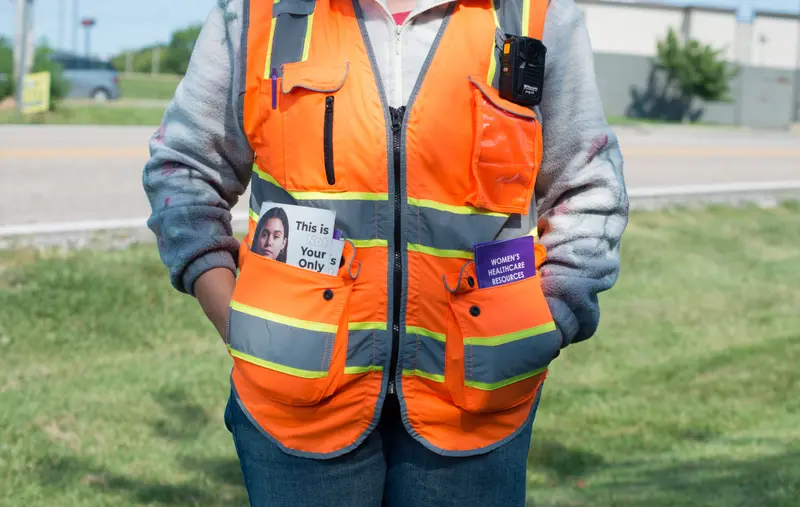 On a recent Saturday outside a Planned Parenthood clinic in Fairview Heights, Illinois, a woman wearing a reflective orange vest and body camera flagged down a car pulling into the facility.