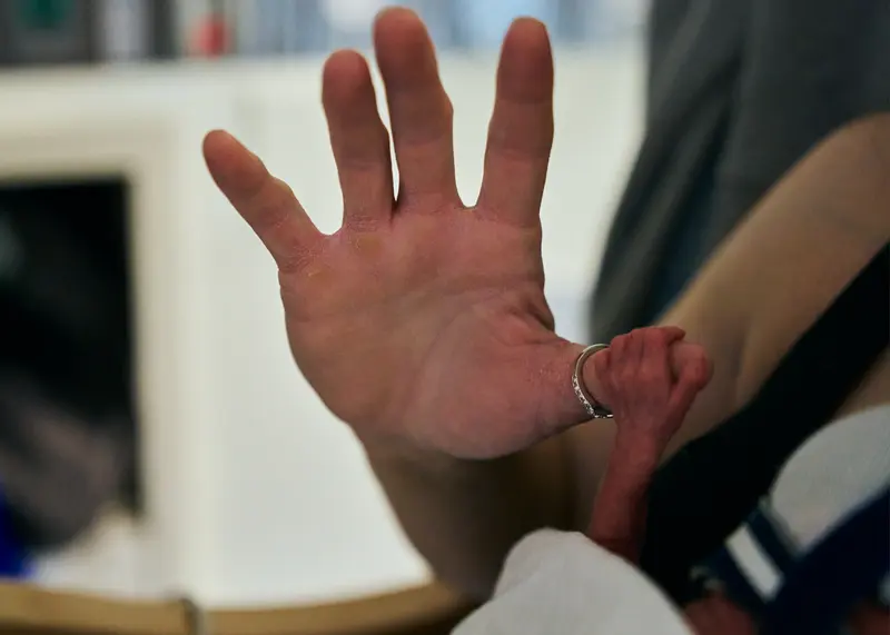 Her skin was pink and translucent, wires and patches poked out from all over her body, and her tiny face was covered with a breathing machine. Nurses told Hollis that Elayna was too fragile to be held. Hollis could only stick a latex-gloved hand through a hole in the crib to feel Elayna’s penny-sized grip on the tip of her finger. Over that first week, doctors monitored Elayna’s brain for bleeding and poured a protein into her breathing tube to help her lungs open and close.
